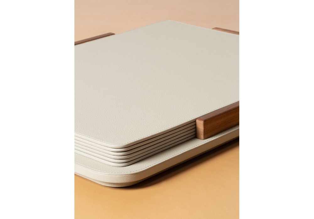 Colección Tableware diseñada por Giobagnara para Poltrona Frau es un juego de 6 manteles individuales íntegramente realizados en Pelle Frau® y un práctico portamanteles revestido en piel con detalles en madera de nogal.