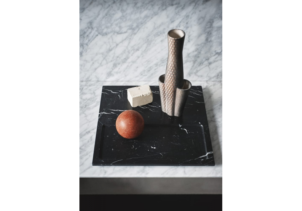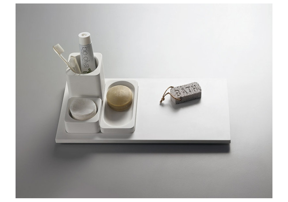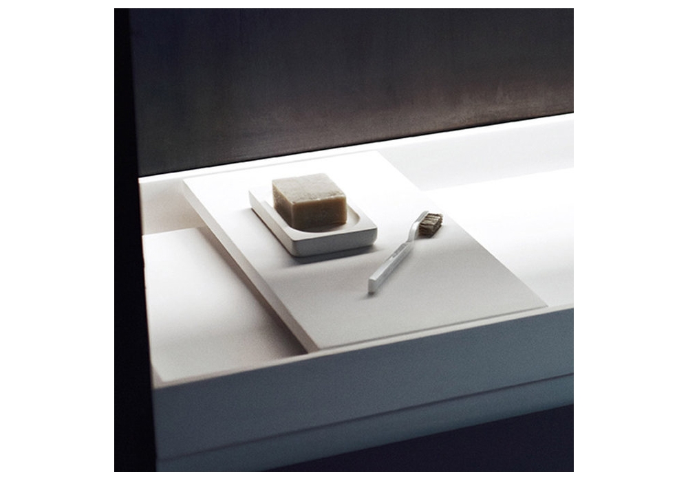 Surf diseñada por Benedini Associati para Agape es una bandeja portaobjetos realizada en Cristalplant® blanco o mármol, que se puede utilizar para apoyar sobre encimeras. En las bandejas también se pueden guardar accesorios de la misma serie.
