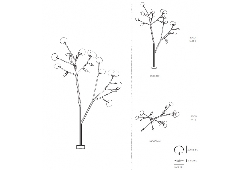 16.20 Hawthorne de la serie 16 diseñada por Omer Arbel para Bocci es una lámpara de exterior. Una instalación en árbol con quince difusores, una estructura modular en acero inoxidable sobre la que se injertan ramas que reproducen la apariencia del espino. El tronco tiene una altura de 3,6 metros, 7 ramas y 20 hojas. Las hojas están disponibles en 4 acabados diferentes.