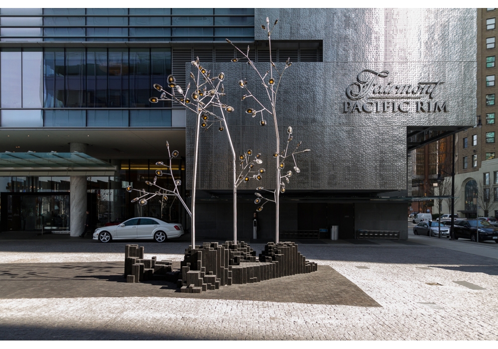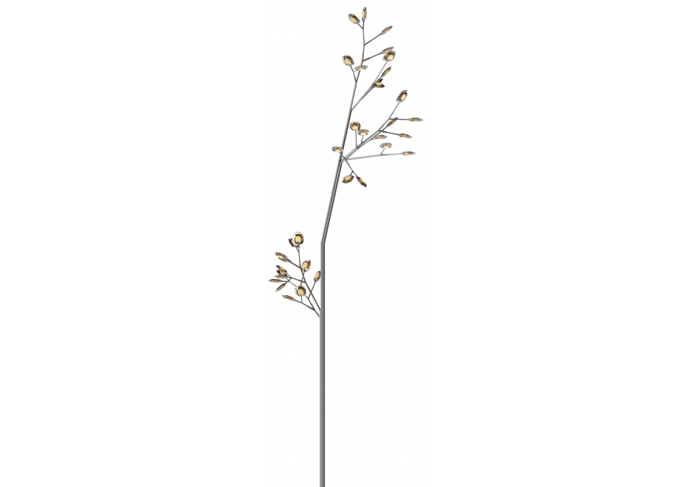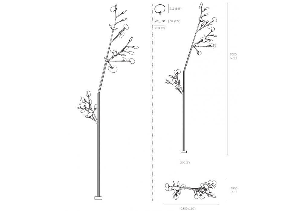 16.35 Aspen de la serie 16 diseñada por Omer Arbel para Bocci es una lámpara de exterior. Una instalación en árbol con treinta y cinco difusores, estructura modular en acero inoxidable sobre la que se injertan ramas que reproducen la apariencia del álamo. El tronco tiene una altura de 7 metros, 7 ramas y 35 hojas. Las hojas están disponibles en 4 acabados diferentes.