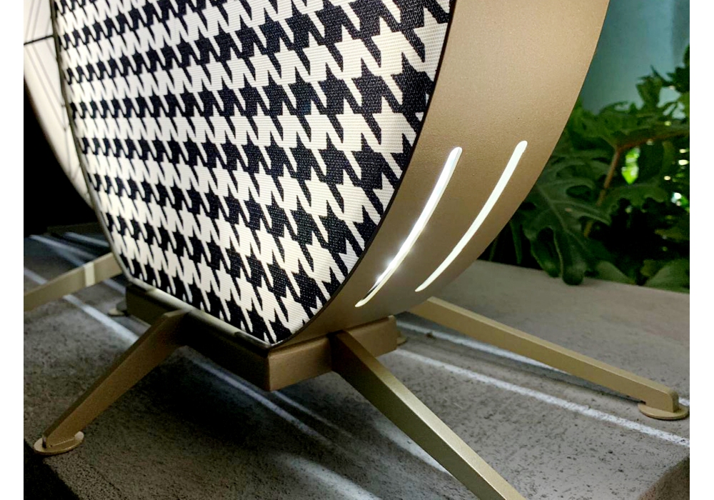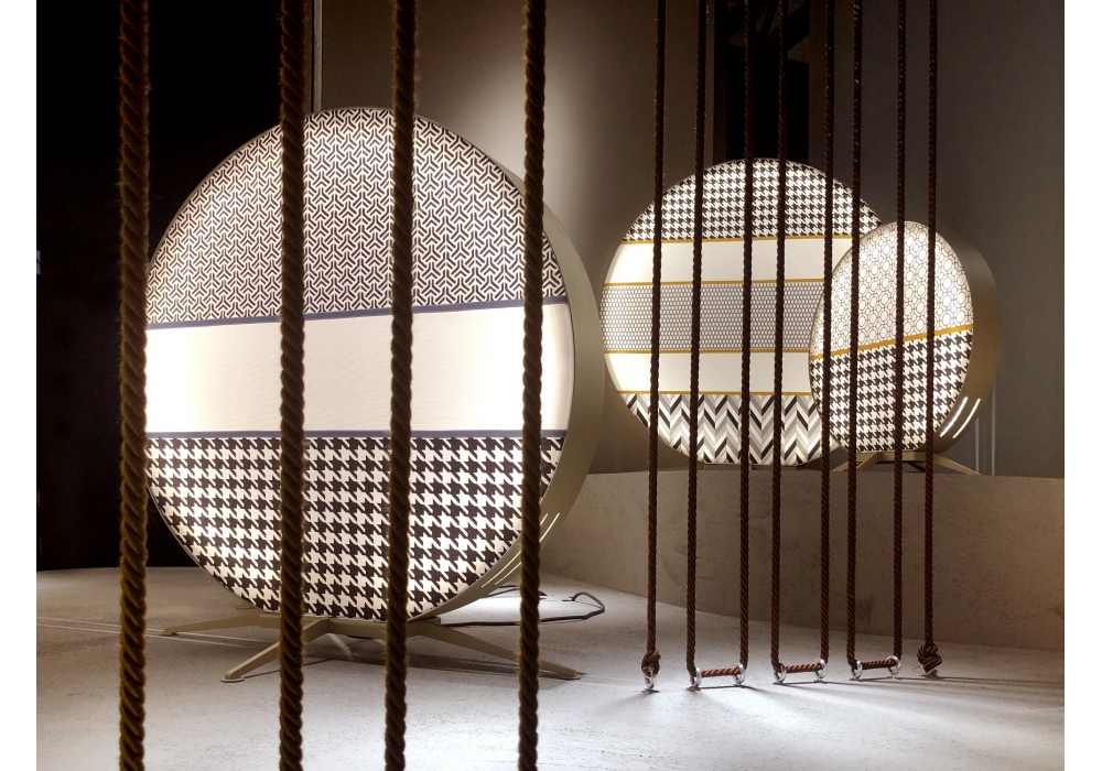 Babu diseñada por Massimiliano Raggi para Contardi es una lámpara de pie de exterior con base y estructura en acero lacado champagne con tratamiento de cataforesis marina. El frente y la espalda están confeccionados con tejido Sumbrella y pasamanerías de terciopelo para ambientes exteriores. Las fuentes de luz adoptadas son del tipo LED Strip. Esta lámpara está disponible en tres tamaños. Babu está disponible en diferentes tamaños y acabados de tejido.