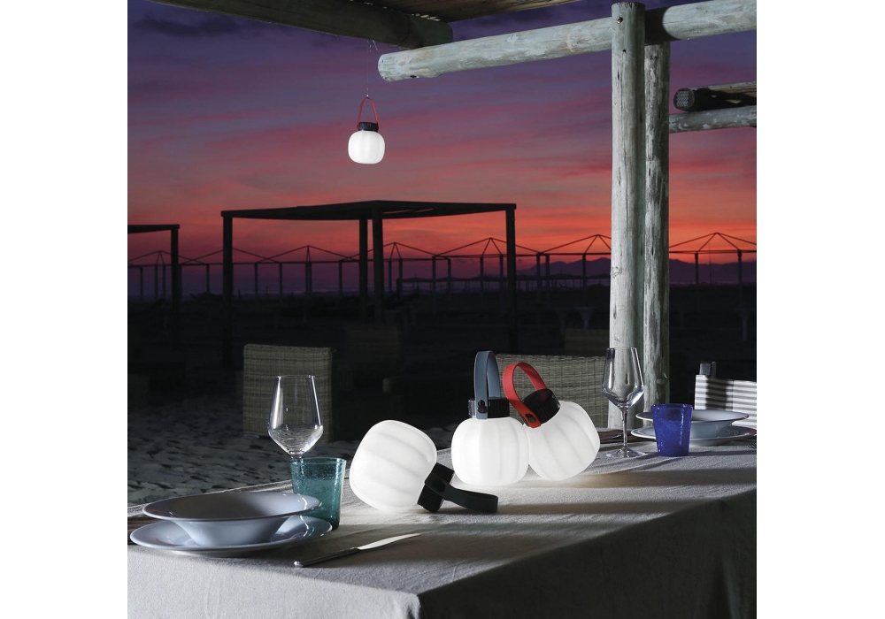 Kiki Cordless diseñada por Paola Navone para Martinelli Luce es una lámpara portátil para exterior con estructura de polietileno y asa de silicona. La fuente de luz adoptada es del tipo LED regulable integrado. Kiki está disponible con asa en diferentes acabados y con o sin cargador.