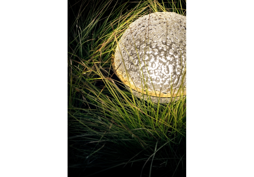 Medousê F diseñada por Enzo Catellani para Catellani & Smith es una lámpara de pie para exterior LED regulable, con forma de esfera irregular de cristal verde o transparente. Los detalles son en latón.