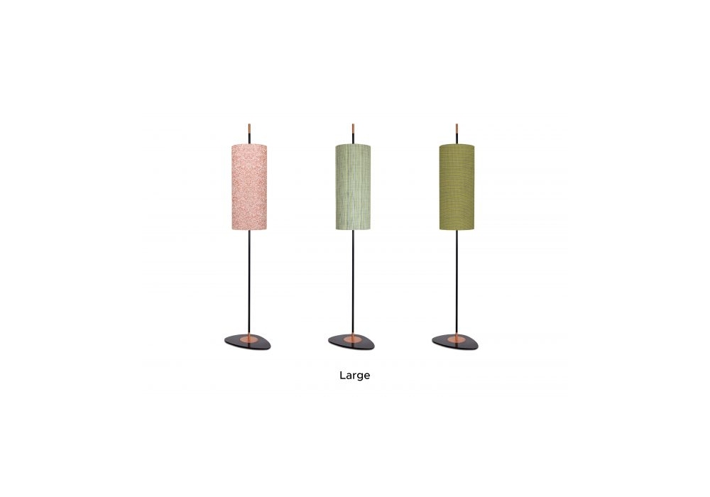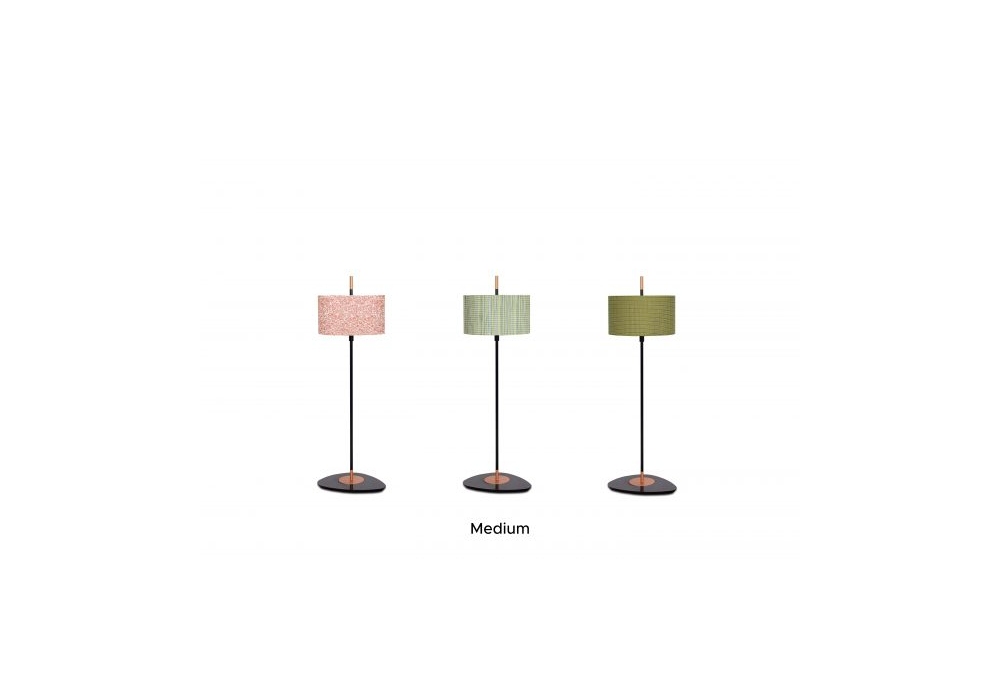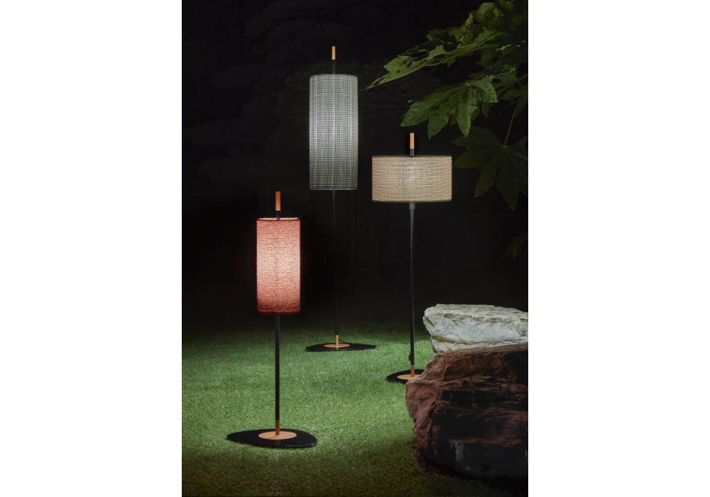 Lago diseñada por Servomuto para Contardi es una lámpara de pie de exterior con base circular y estructura vertical en metal lacado negro mate con detalles en color cobre. La pantalla circular de tela protege una fuente de luz con casquillo LED E27. Lago está disponible en diferentes modelos y acabados de pantalla.