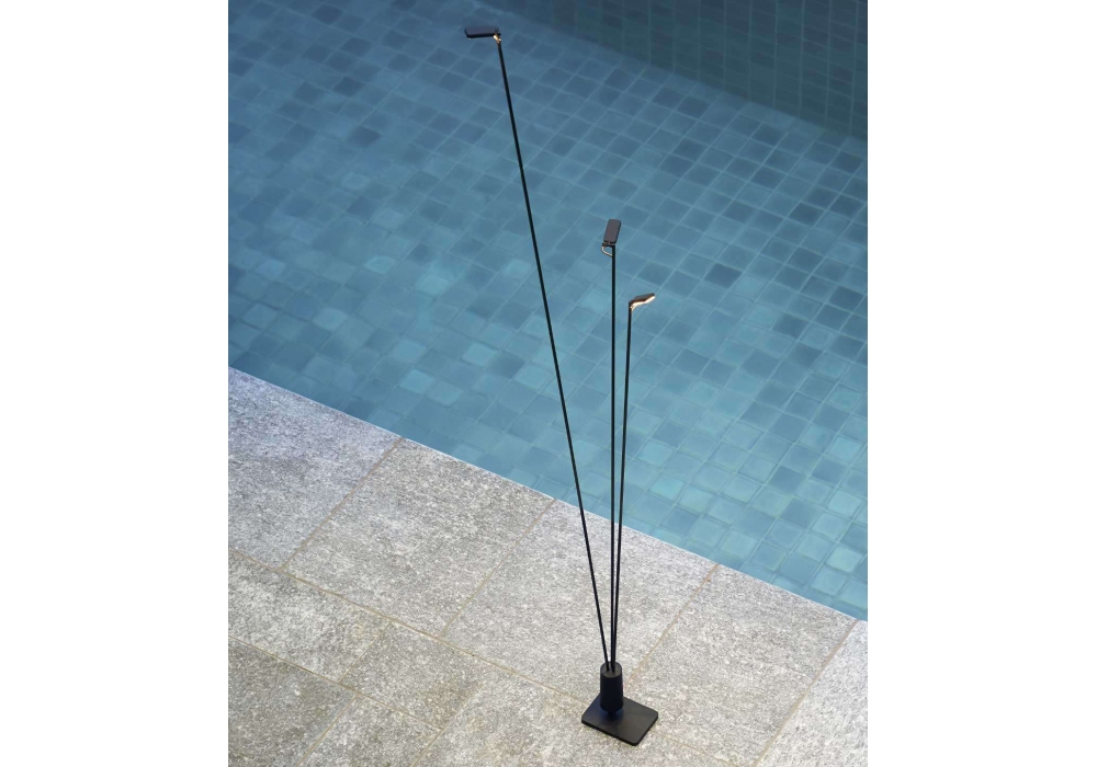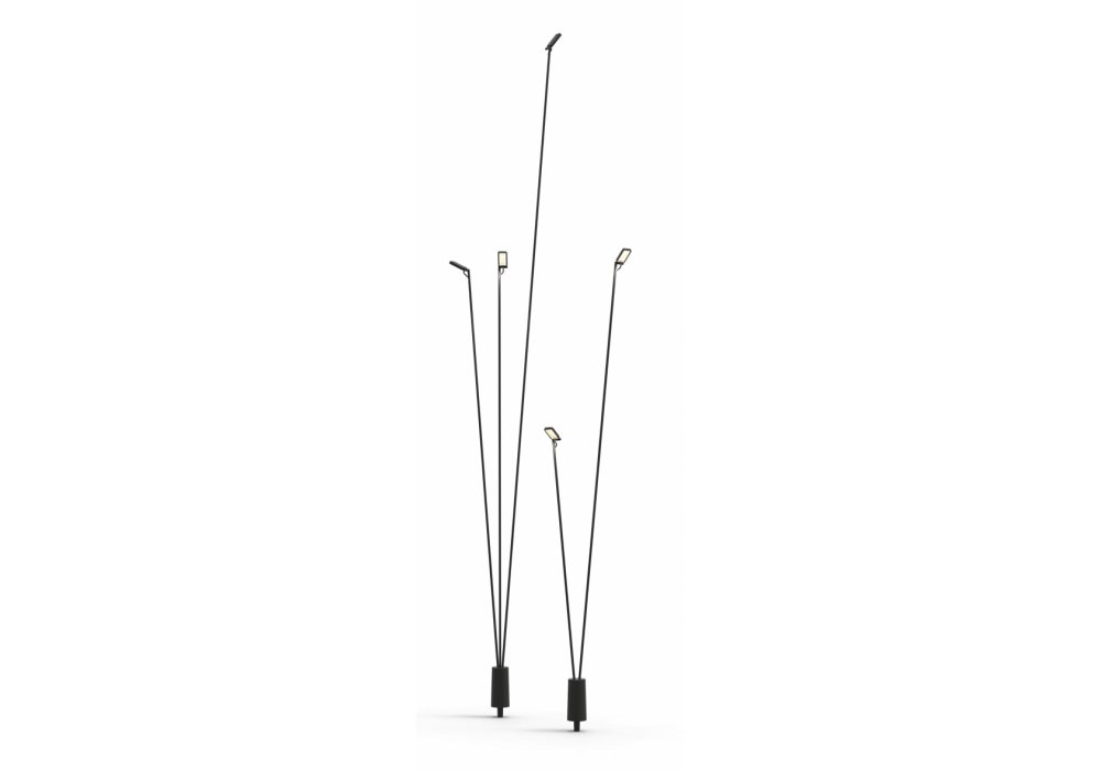 Flia diseñada por Alessandro Zambelli para Luceplan es una lámpara de pie múltiple, con brazos en fibra de carbono negro mate y difusor de aluminio. Es posible elegir entre una base rectangular o una espiga. Disponible en diferentes versiones.