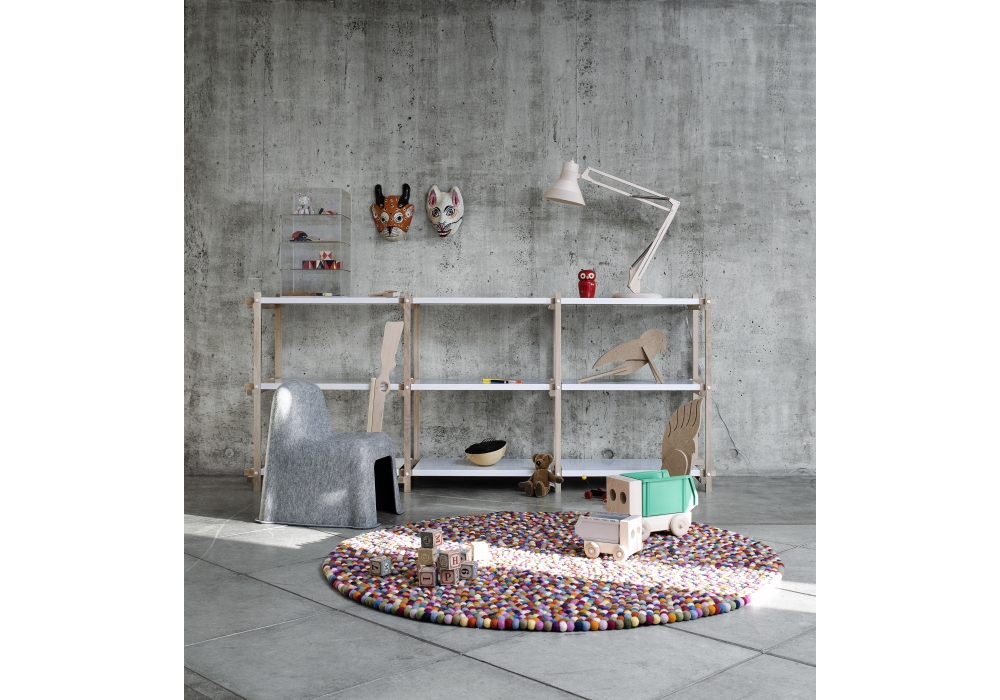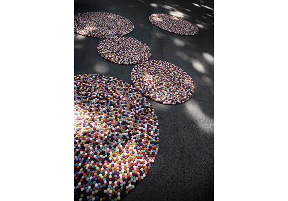 Pinocchio diseñada y producida por Hay es una alfombra compuesta por ovillos de lana multicolor hechos a mano en Nepal con métodos artesanales tradicionales; cada uno se enrolla individualmente, se ensarta en una cuerda y se cose en una alfombra circular. Disponible en diferentes dimensiones.