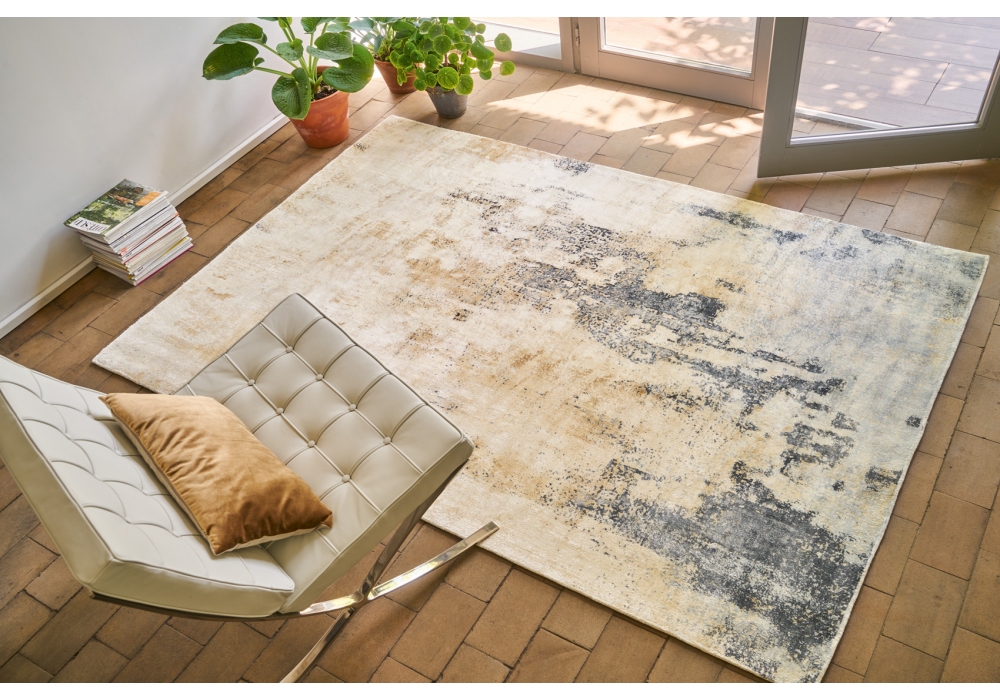 Patina diseñada por Serge Lesage es una alfombra de viscosa tejida y pintada a mano. Está disponible en diferentes tamaños.