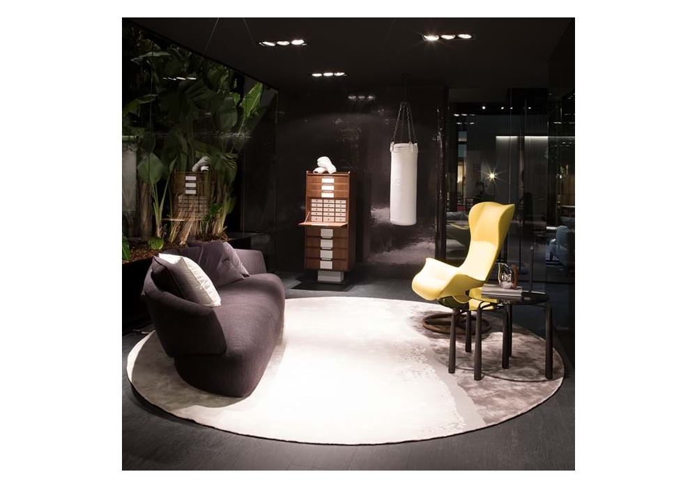 Moonshadow diseñada por Giorgetti es una alfombra en seda de bambú o seda natural, realizada con la técnica de tufting a mano. La superficie se caracteriza por el tratamiento de la fiba con la técnica de loop para crear una sutura entre los dos colores que forman el diseño. La alfombra está disponible en diferentes formas, con tamaños personalizados.