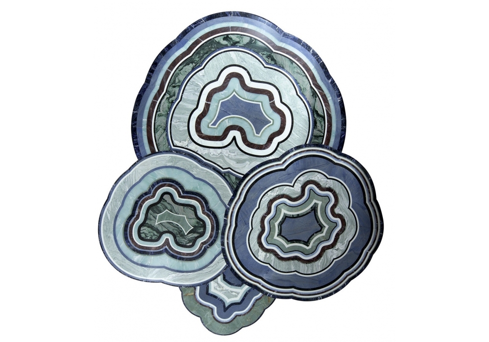 Agata diseñada por Patricia Urquiola para Budri es una alfombra realizada en precioso mármol y ónix, en tonos marinos de azul y verde.