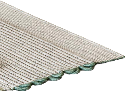 está tejida con cuerda de 3 mm de sección y la banda decorativa con cuerda de 16 mm de sección. La superficie puede tener diferentes formas y tamaños, con decoraciones a su elección.