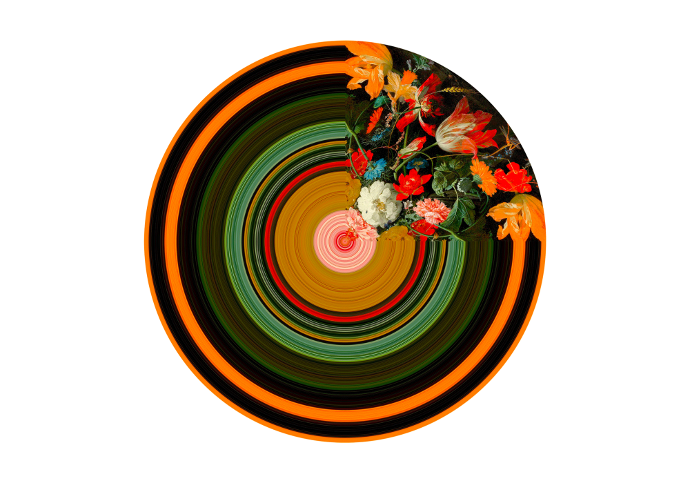 Glitch Round Quarter diseñada por Richard Hutten para Qeeboo es una alfombra circular en poliéster antideslizante y poliamida con varios tonos de color.