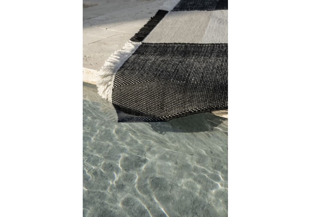 Tres Outdoor diseñada por Nani Marquina y Elisa Padrón para Nanimarquina es una alfombra de exterior enmarcada a mano realizada con fibra PET 100% reciclada. Disponible en diferentes acabados y dimensiones.