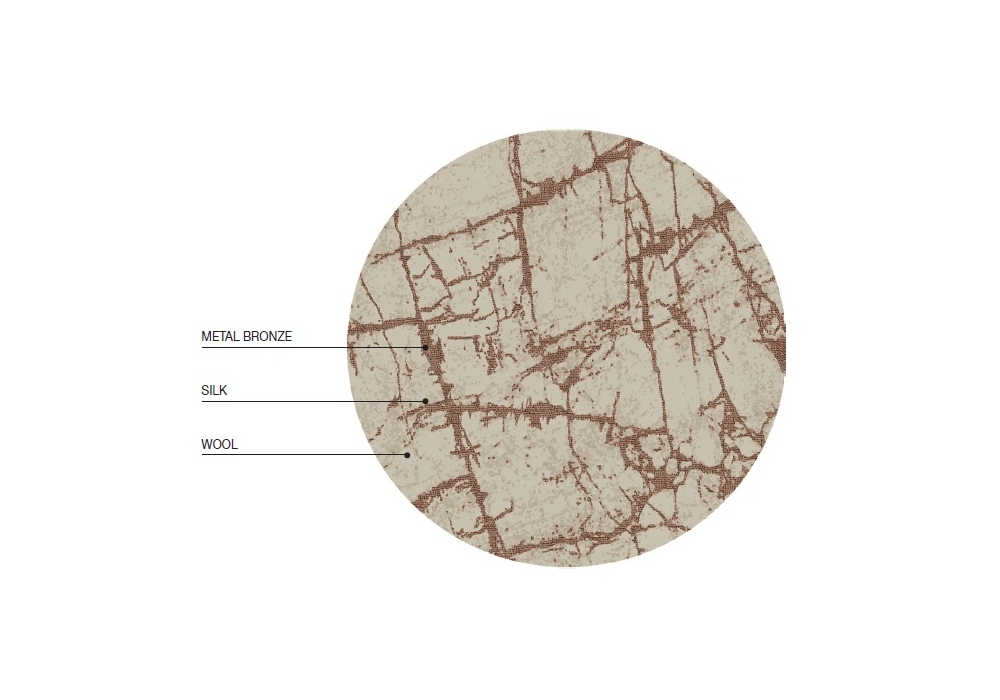 Wound diseñada por AL1 para Longhi es una alfombra hecha a mano en telares de madera compuesta por 50% seda y 50% lana. Base en lana, dibujo en relieve en seda con particular inserción en metal bronceado. Disponible en modelo redondo o rectangular.