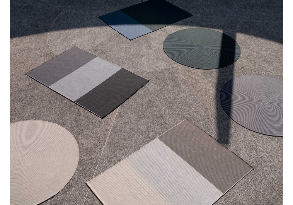 Clue Round diseñada por Bernhardt & Vella para Potocco es una alfombra redonda para exterior realizada en hilo de polipropileno tejido a mano. Tintado en masa con protector UV especial y antioxidantes, lo que lo hace resistente a los agentes externos como la luz solar, el cloro y las manchas.