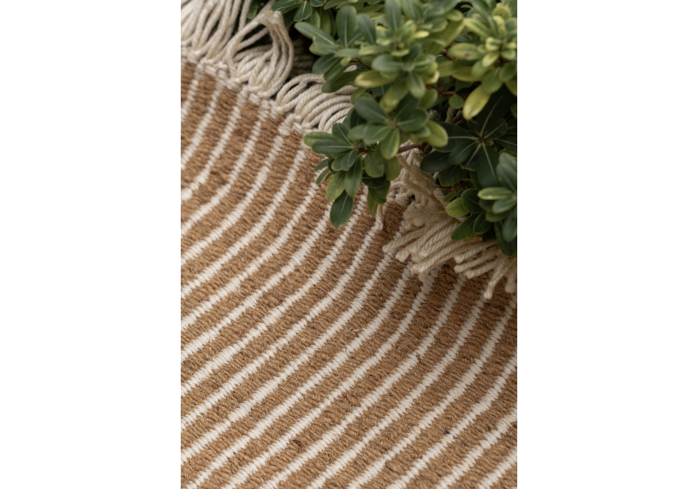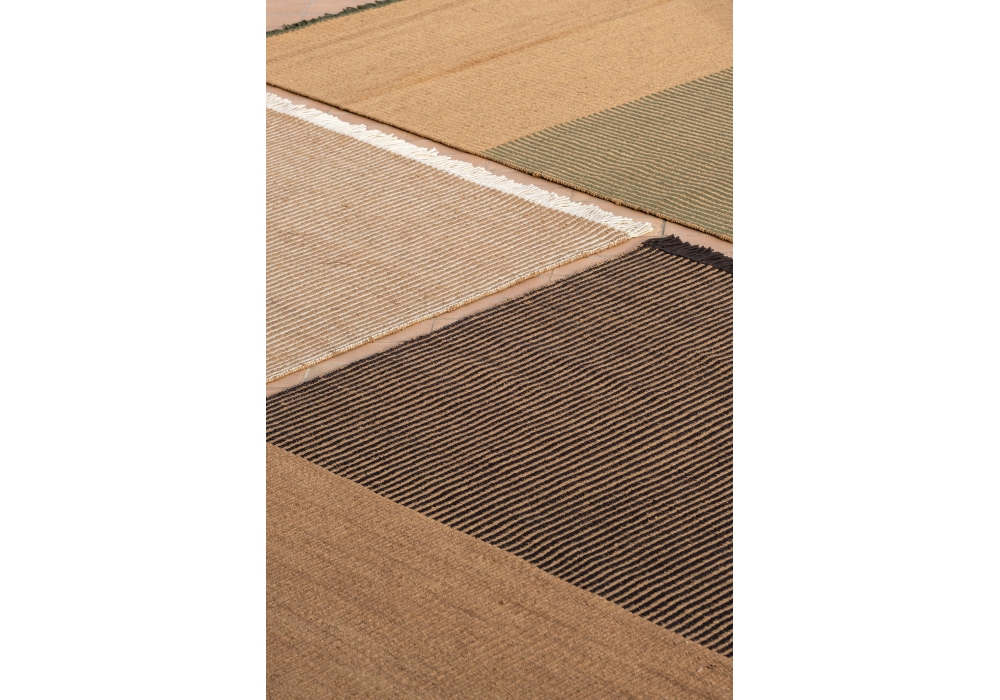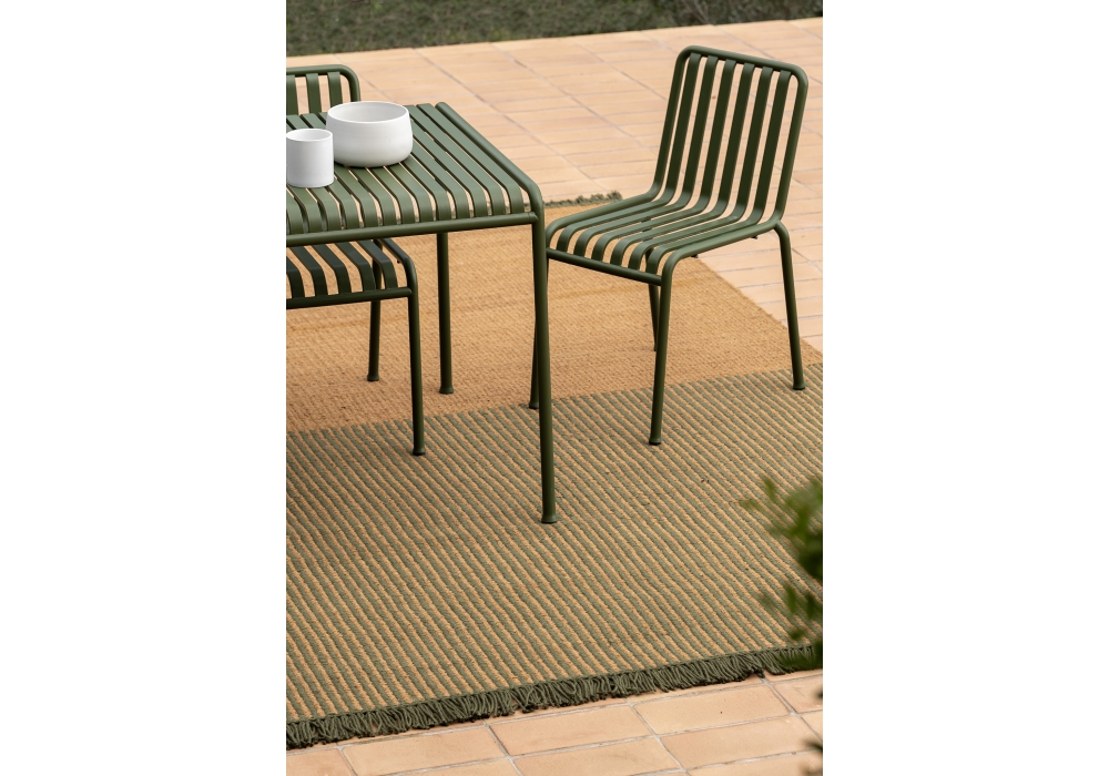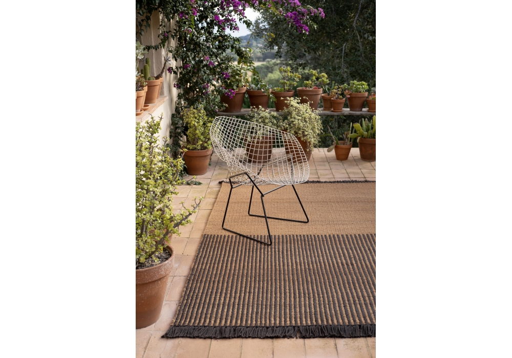 Garden diseñada y producida por NaniMarquina es una alfombra de exterior Dhurrie tejida a mano. Está hecha con un 60 % de fibra de coco y un 40 % de PET reciclado.