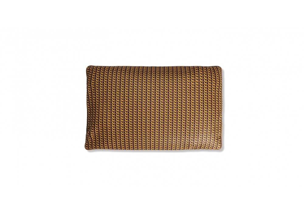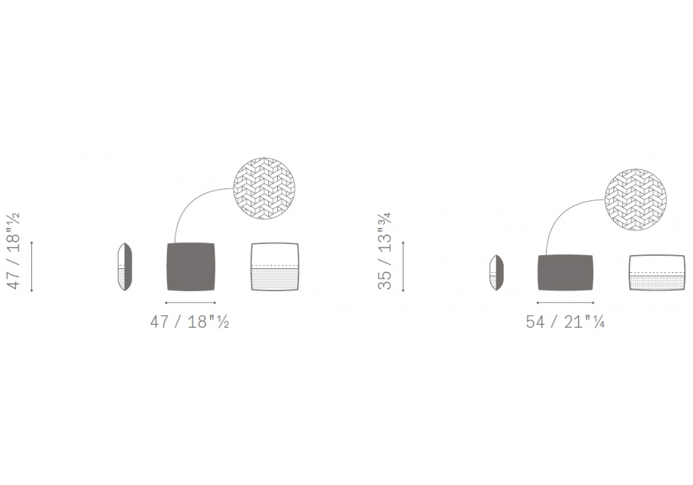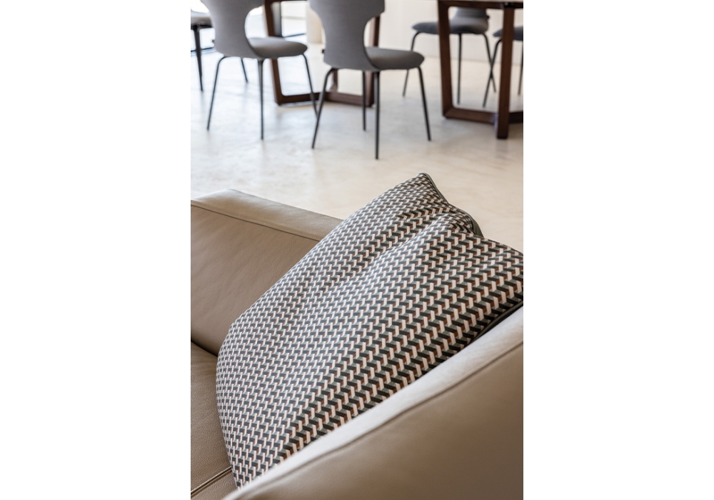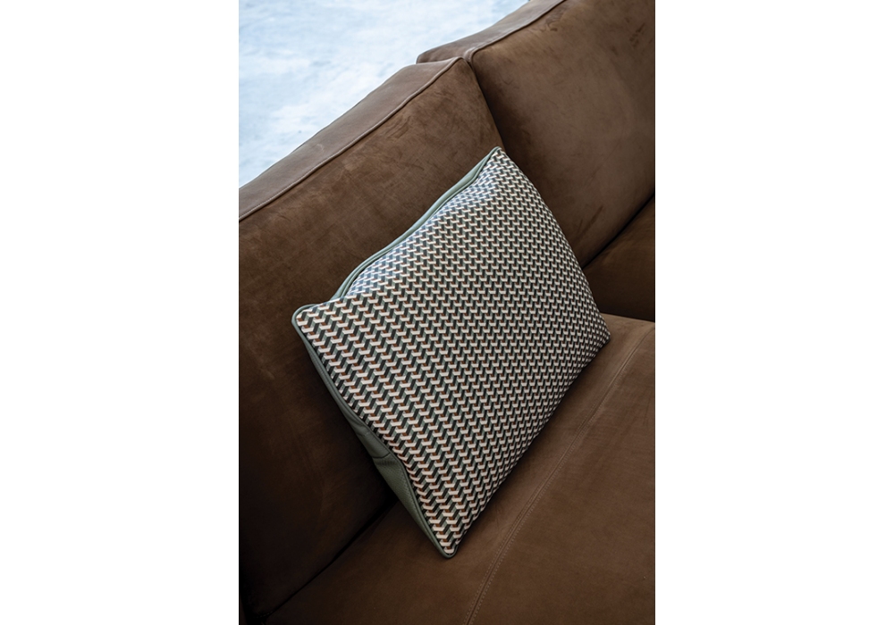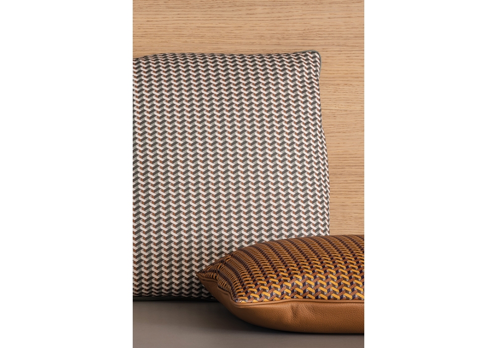 I Cuscini Decorativi - Motif Weavers diseñado por Simona Cremascoli para Poltrona frau es un cojín con relleno de pluma de ganso protegida por un forro interior de algodón. Los cojines delanteros están tapizados con Pelle Frau® Motif Weavers, un cuero impreso digitalmente con un patrón geométrico que recuerda el mundo del tejido. El dorso es de piel monocromática Pelle Frau® ColorSphere® (SC).