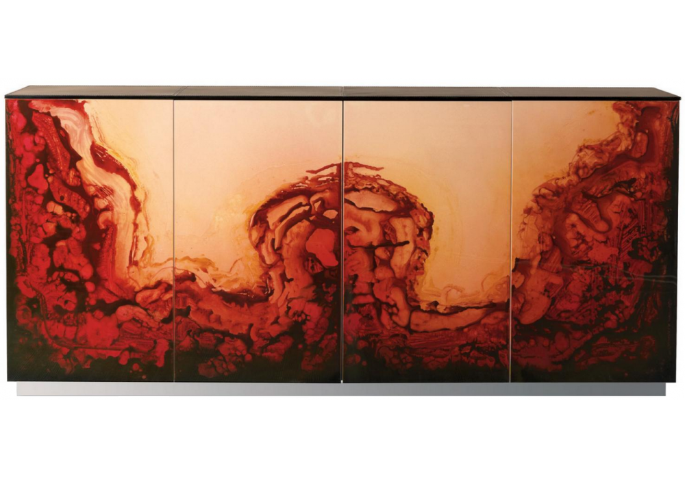 Atlanta diseñado por Rugiano es un aparador de cuatro puertas con decoración en diferentes acabados y estructura en madera lacada. Detalles en latón bronceado o cromado.