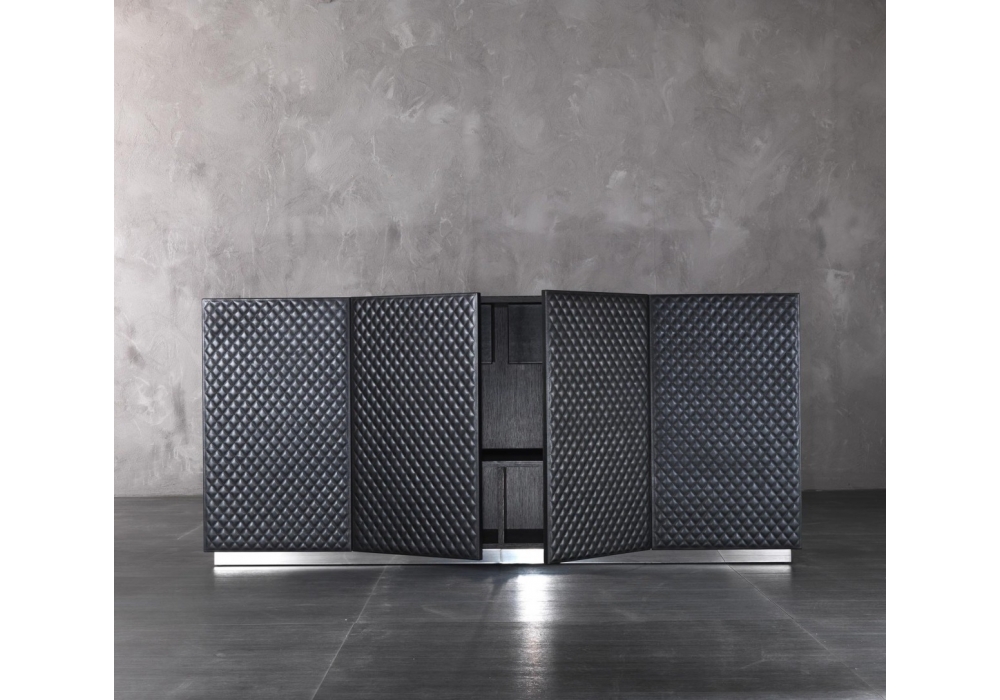 Julia diseñado por Rugiano es un aparador con 4 puertas y estructura en piel. Detalles en latón bronceado o cromado. Respaldo interior lacado y espejo.