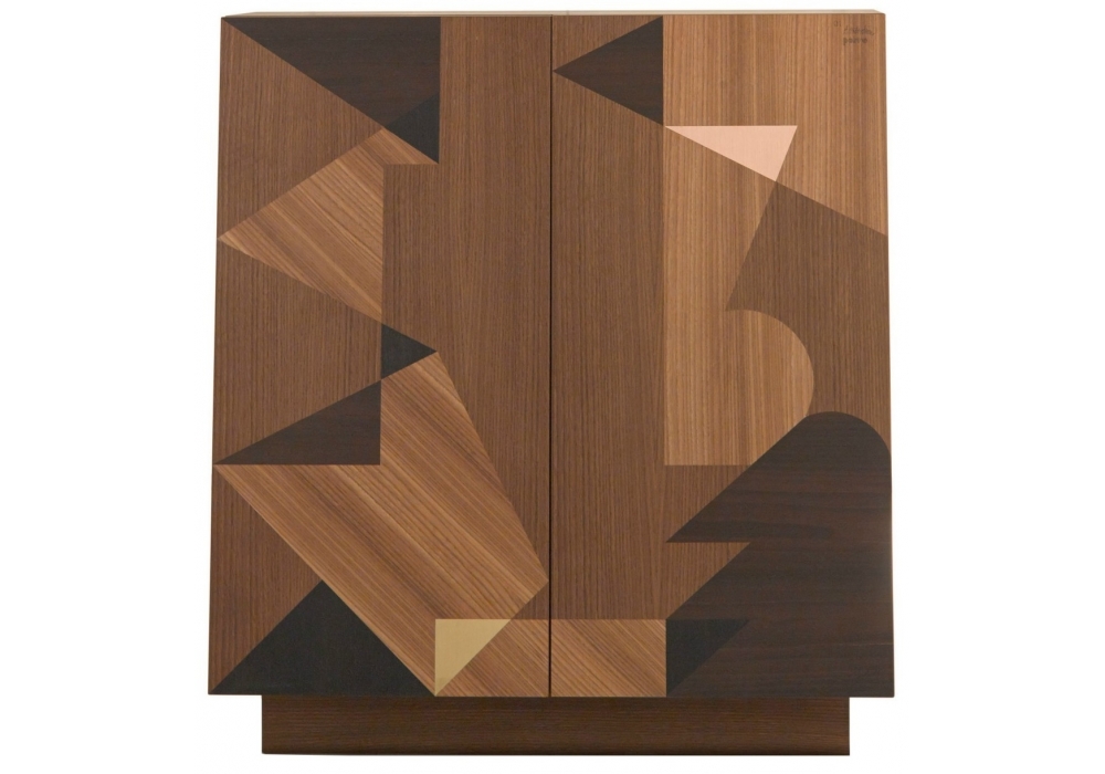 Schermo designed by Alessandro Mendini is a square cupboard on a base with a sloping hinged door. It is created with an inlaid design on the front, achieved by combining three different types of wood – elm, oak and acacia – according to abstract geometric compositions that meld the points of the triangle with the curved contours of the circle in unexpected directions.
