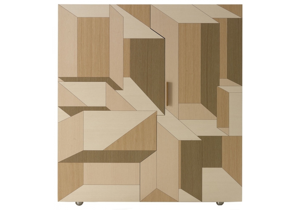 Inlay is a sideboard designed by Front for Porro. Inlay entirely recovers the inlay technique, an ancient and precious old time tradition. A sideboard for the sitting room covered with a decoration recalling parallelepipeds crossed in space, leading to a unique 3 D effect. Inlay is the result of an accurate processing technique, with 4 different oak colours and a black profile: a contour line separating the different faces of the texture while defining the design. The sideboard exhibits a unique asymmetrical opening and it is internally fitted with simple shelves and separators. The Inlay handles are in solid oak; the interior is in natural oak.