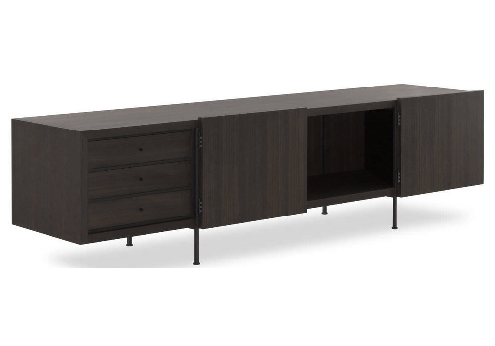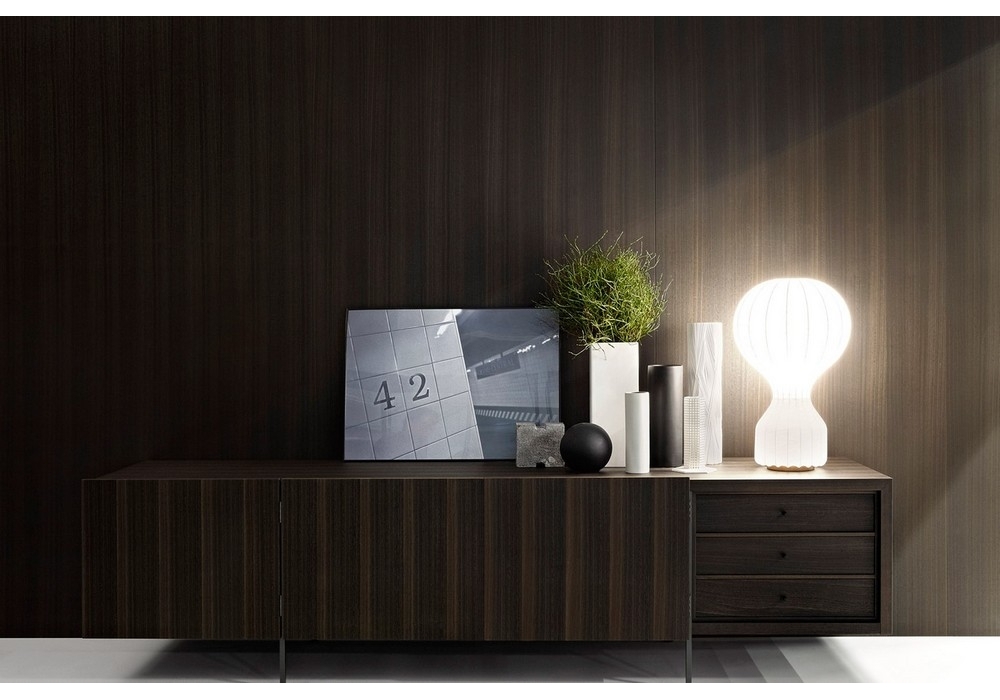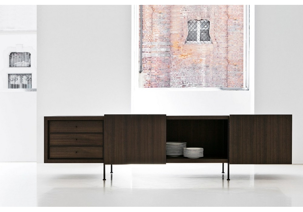 Tiller is an low sideboard designed by Piero Lissoni for Porro. Tiller exhibits 4 doors to be opened, one over the other at 180°, a detail pleasantly changing its face design. Raised on 4 metal matt feet from the floor, the sideboard stands out once more for the brand technical expertise, able to test new opening systems and technologies.