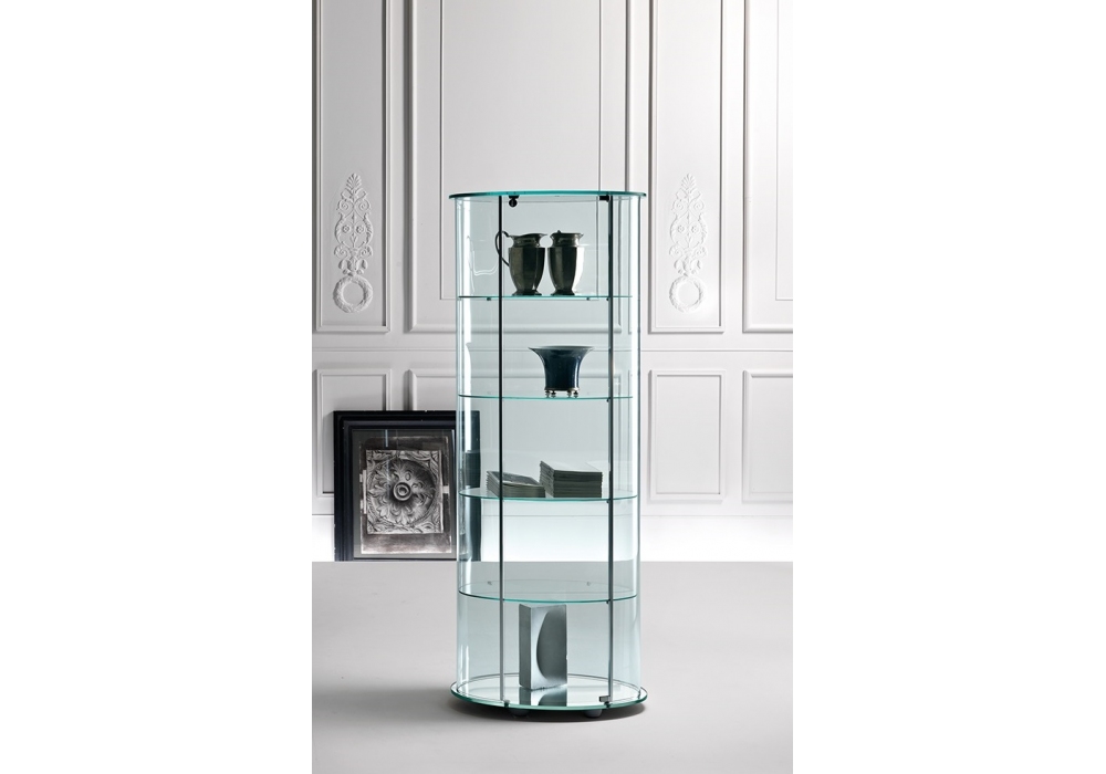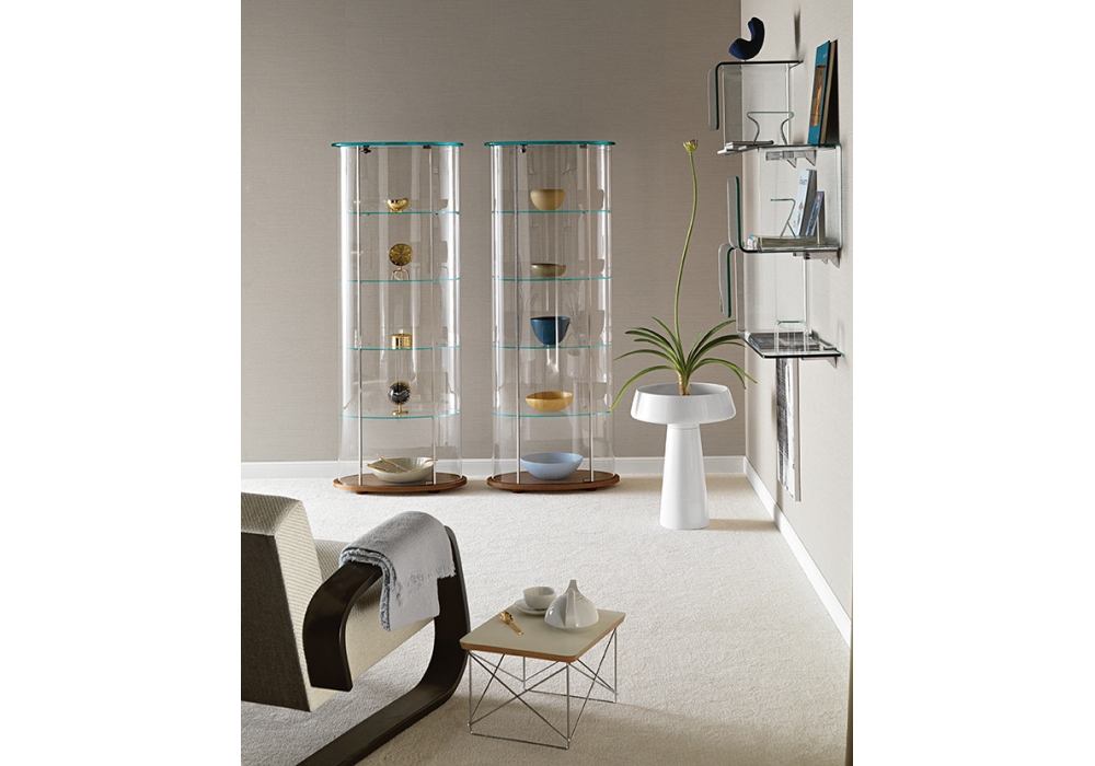 Palladio diseñada por Vittorio Livi para Fiam es una vitrina electrificada realizada en vidrio curvado con cuatro estantes fijos y una puerta con cerradura. Perfilería de aluminio en acabado brillo cepillado. Base en cristal o madera de nogal canaletto. Como accesorio es posible añadir un kit de iluminación que también se puede colocar debajo de la encimera.