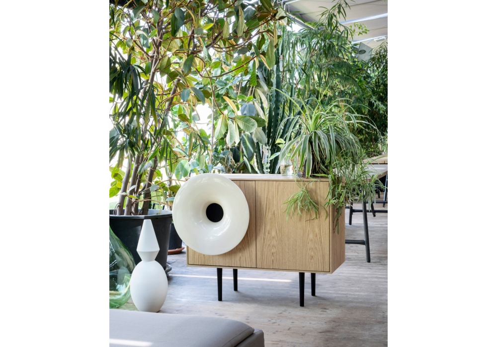 Caruso diseñado por Paolo Cappello para Miniforms es un aparador con sistema de audio. Estructura en madera y trompeta en cerámica disponible en diferentes colores. Disponible en dos tamaños y en versión LED.