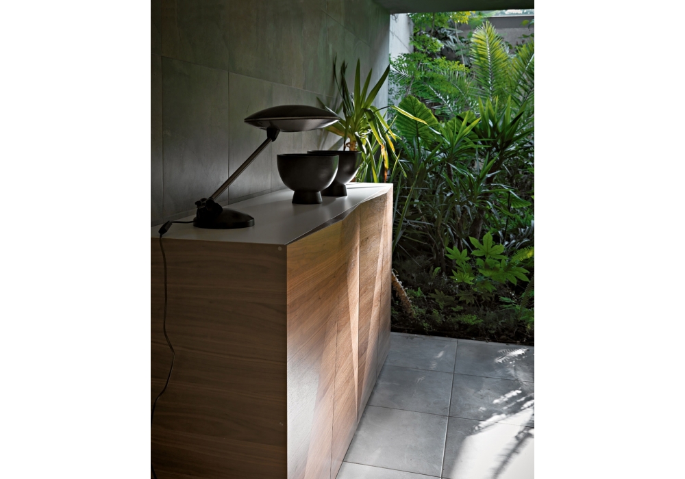 Not Riddled diseñado por Steven Holl para Casamania & Horm es un aparador realizado con estructura en tablero de partículas de madera lacada o paneles de MDF. Laterales y puertas realizados con un material creado y patentado por Horm consistente en un sándwich de chapa de nogal Canaletto y tejido de 2,2 mm de espesor que, gracias a las incisiones superficiales realizadas con corte láser, se pliega como un origami. Estantes en vidrio templado transparente, canto pulido, espesor 5 mm.