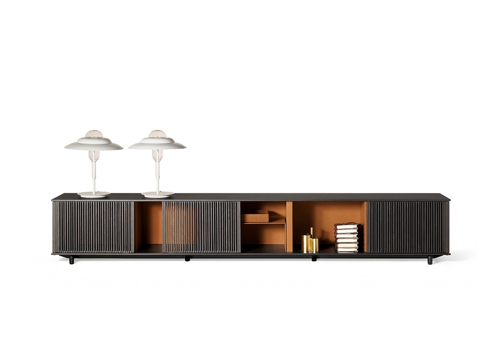 Lloyd designed by Jean-Marie Massaud for Poltrona Frau is a sideboard with variable geometries. A series of thin vertical wooden rods form light grids that run from top to bottom on invisible horizontal guides. Each grid can be moved as desired creating diff erent sequences each time. A fluctuating score of solids and voids, of light and shade.