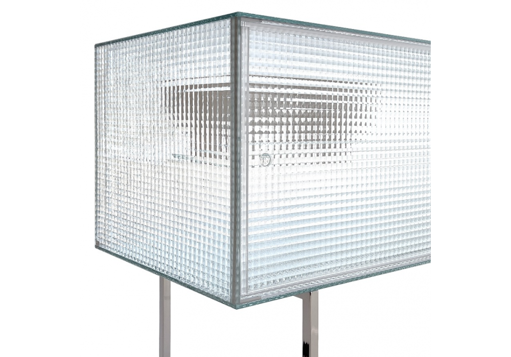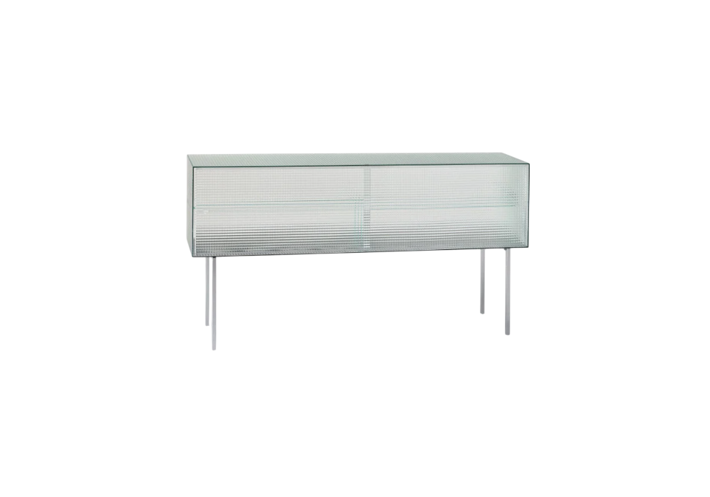 Commodore designed by Piero Lissoni for Glas Italia is a sideboard realized in crystal printed stripes or squares, toughened and glued at 45°, with mirror finish. The legs are in chromium plated metal, while the sliding doors are placed in plexiglass guides.