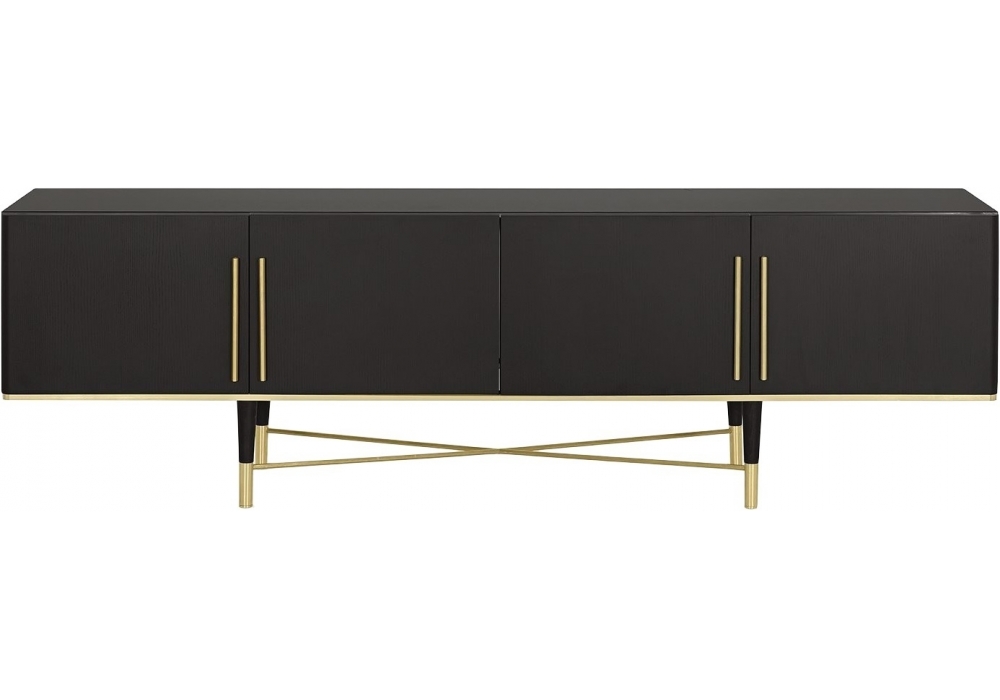 Tama Crédence diseñada por Carlo Colombo para Gallotti & Radice es un aparador en fresno teñido a poro abierto negro con partes metálicas lacadas en latón satinado. Tapa de cristal templado de 6mm y fondo interior de 6mm ambos pintados regaliz brillo. Motivo romboidal grabado en el interior de la parte trasera del cristal. Se suministra con repisa de vidrio templado ahumado “grigio Italia” de 8 mm y bandejas de madera. Incluye una luz LED interior que se enciende mediante un sensor cuando se abren las puertas.