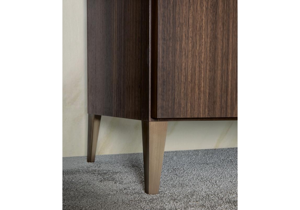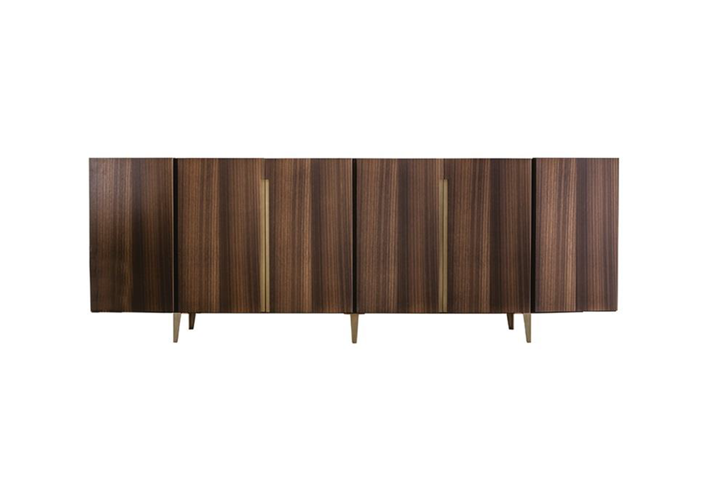 Garbo de Casamilano Studio es un aparador con estructura de MDF revestido de eucalipto termotratado o roble ahumado, tiradores y patas de metal acabado latón y baldas de cristal bronce templado.