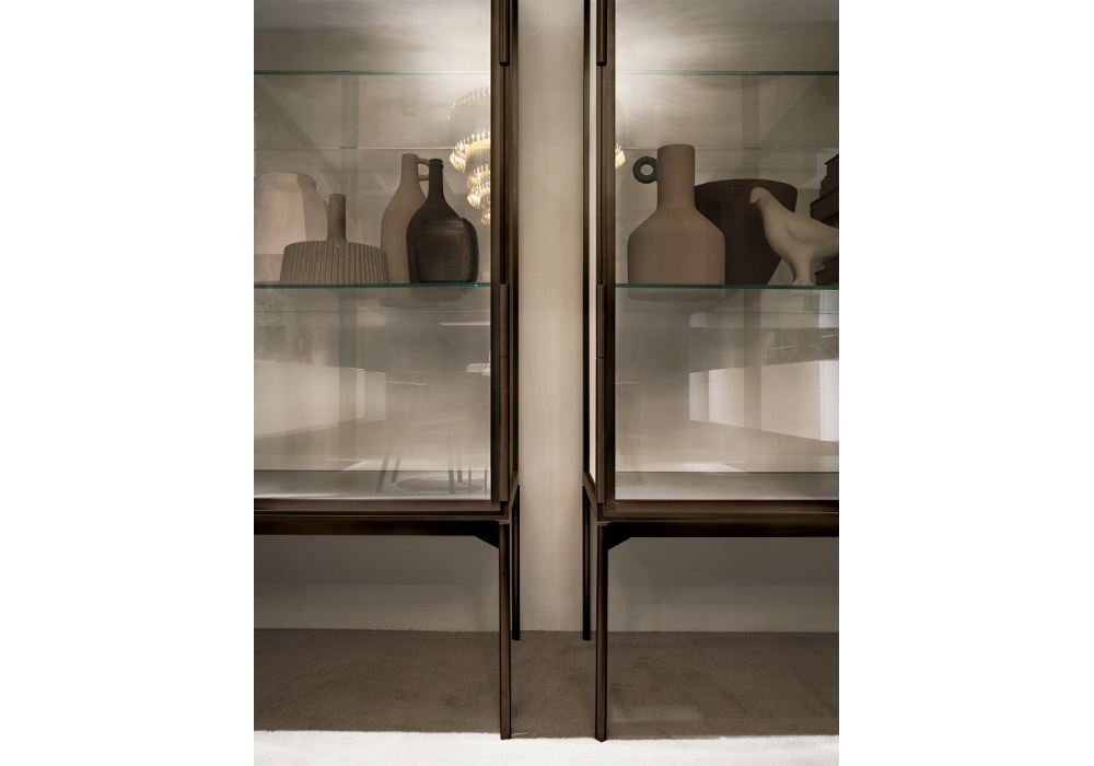 Galerist diseñada por Christophe Pillet para Lema es una vitrina de cristal extra light con estructura en en metal barnizado bronce.