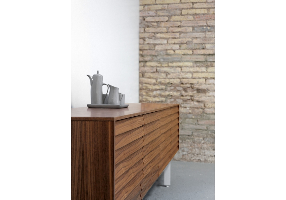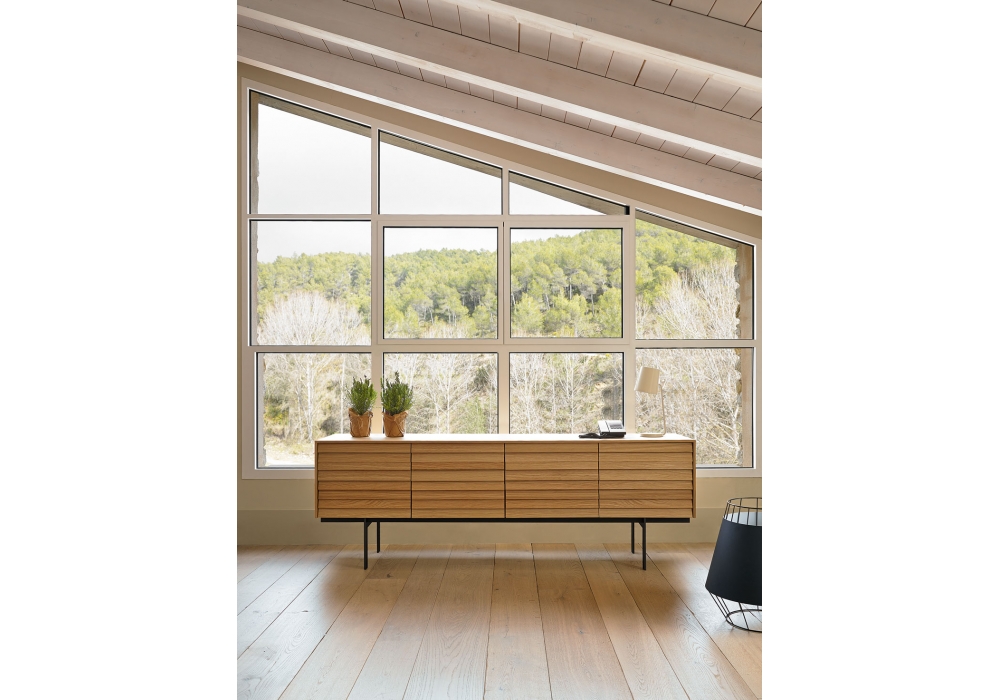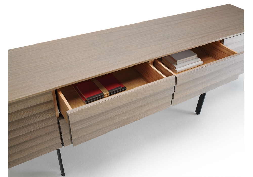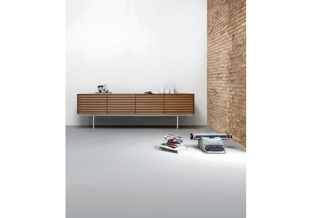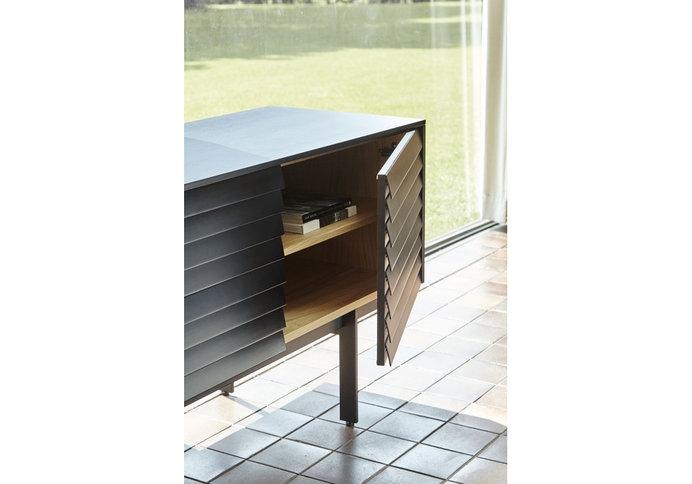 Sussex diseñado por Terence Woodgate para Punt es un aparador en madera chapada en roble o nogal y estructura en acero pintado en polvo color bronce o negro. Puertas con apertura de 94° y, en su caso, cajones con cierre de absorción. Disponible en diferentes acabados y dimensiones.
