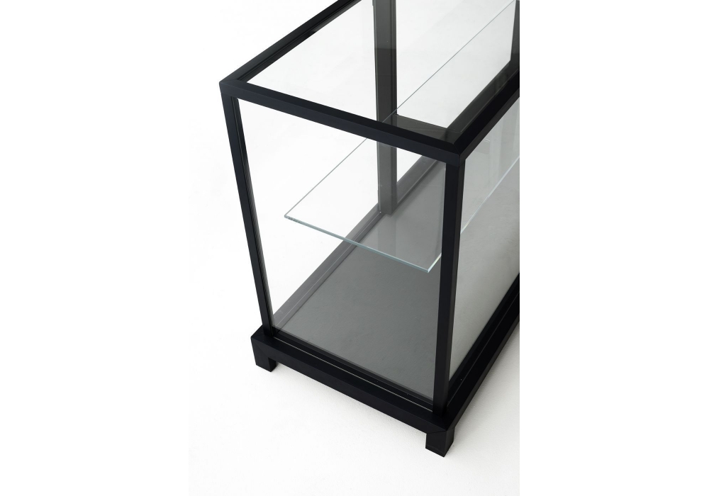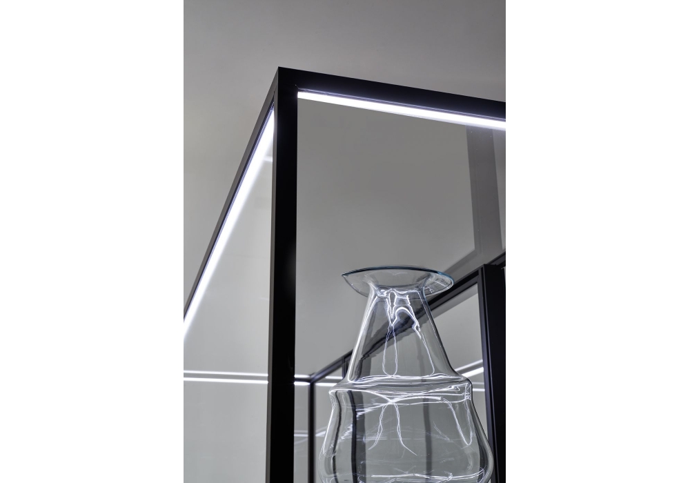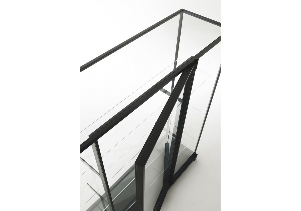 Wunderkammer diseñada por Piero Lissoni para Glas Italia es una hermosa vitrina con una estructura en aluminio anodizado dark brown o barnizado blanco mate, con detalles muy cuidados, y pinceladas en cristal transparente extralight templado. La base esta revestida por un cristal laqueado mate. Los estantes están sostenidos por abrazaderas regulables fijadas a dos montantes verticales, en los que se fija la puerta dotada de bisagras especiales regulables. Estas piezas, a pedido suministradas con cerradura y completamente desmontables, son ideales para contextos de museos y comerciales y, gracias al cristal extralight y delgadez de la estructura, garantizan una visibilidad perfecta de los objetos a 360°.