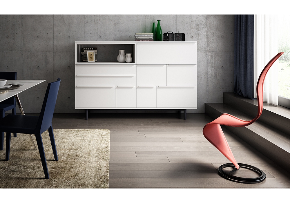 Easy diseñado por Cappellini es un mueble alto con puertas, cajones o aberturas que se caracterizan por extrema ligereza visual. Los tableros pueden ser con acabado lacado o en madera y mármol. También disponible en diferentes modelos.