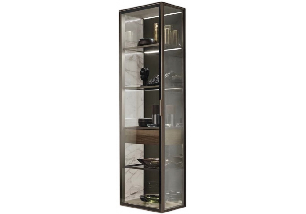 Alambra diseñada por Giuseppe Bavuso para Rimadesio es una hermosa vitrina suspendida con estructura bronce, puerta y paneles laterales en vidrio transparente reflectante , panel de resplado en espejo gris y estantes en vidrio transparente gris.