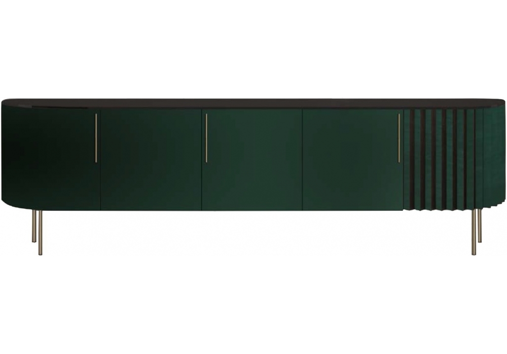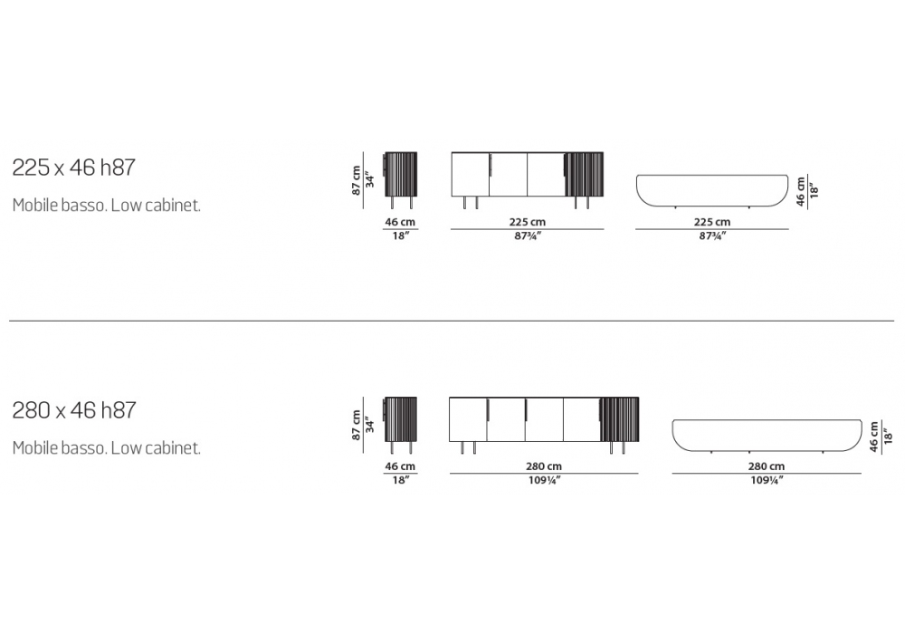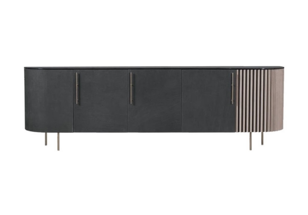 Plissé diseñado por Draga&Aurel para Baxter es un aparador con base en latón bruñido. Estructura en MDF y interior chapado en arce natural con respaldo exterior en roble teñido negro mate. Puerta curvada en contrachapado de álamo chapada roble negro en el interior y exteriormente realizada con patrón triangular plisado. Este patrón es realizado en roble teñido negro mate por un lado y recubierto de piel por el otro.