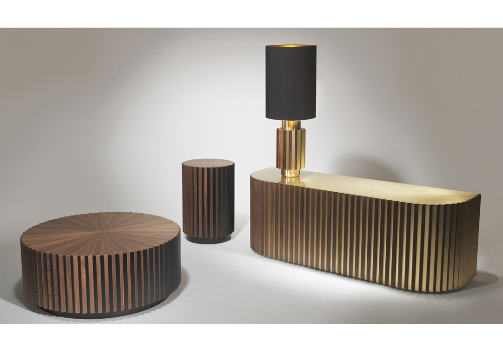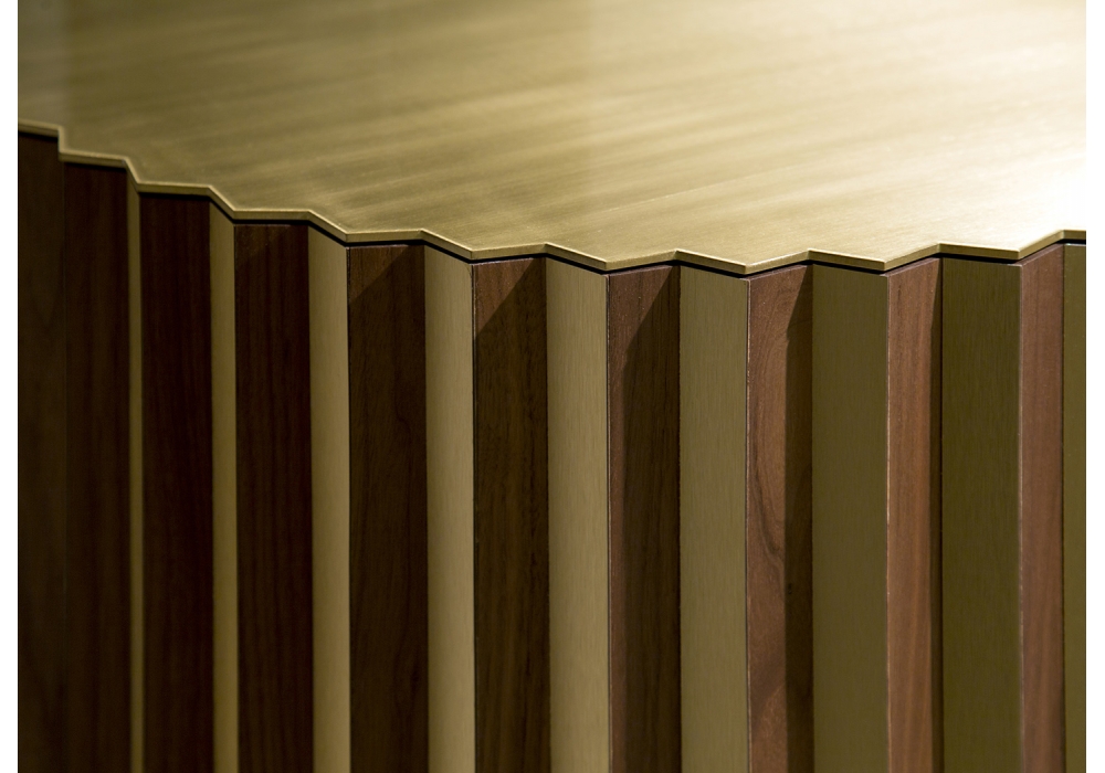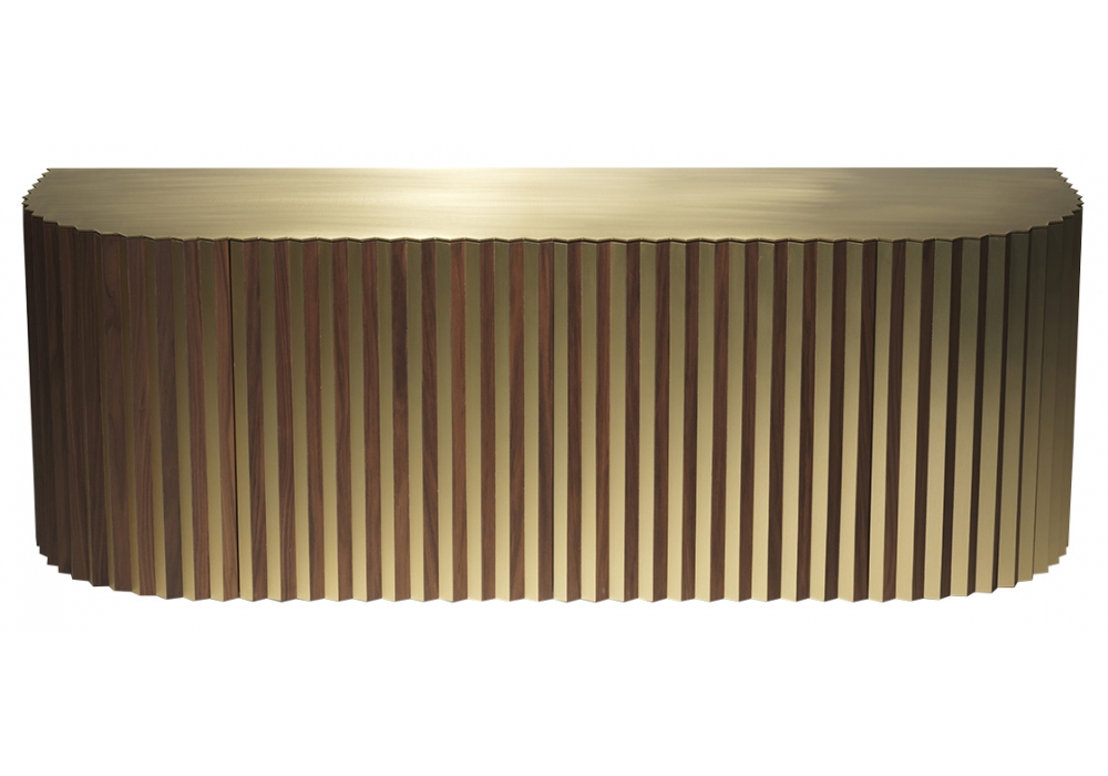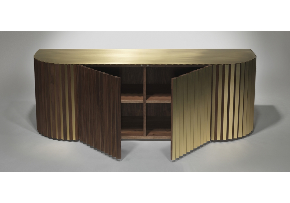 Shadow diseñado y producido por Lee Broom es un aparador de dos puertas estructurado en madera de nogal americano revestido en latón moldurado y satinado. La tapa es siempre de nogal y latón cepillado con un espesor de 3 mm.