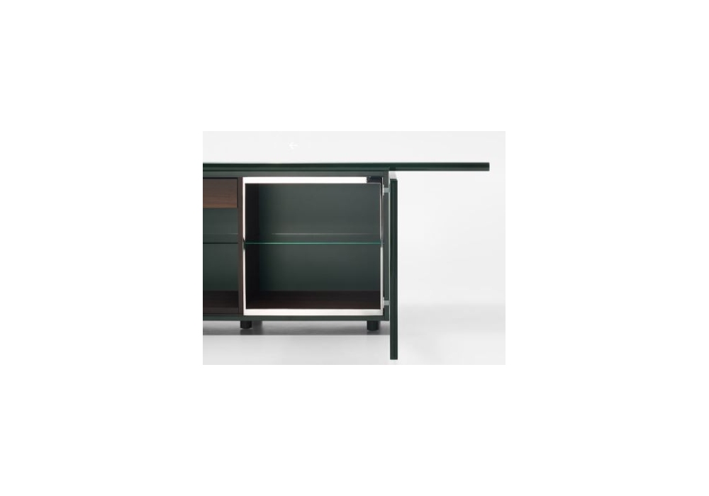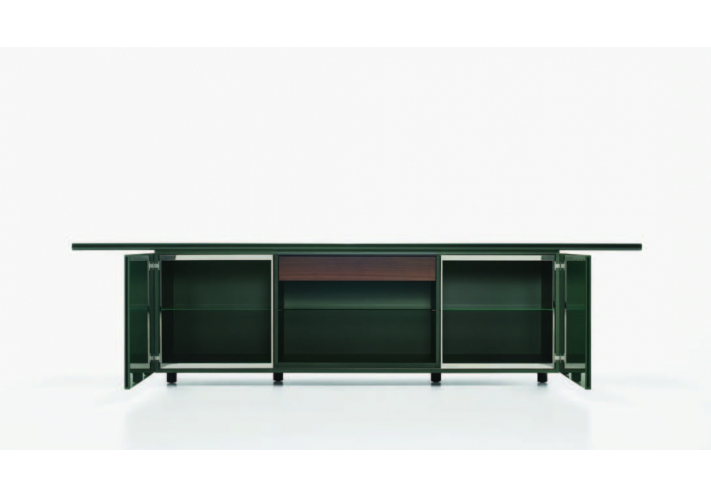 Sheraton diseñado por Giotto Stoppino y Lodovico Acerbis para Acerbis es un aparador icónico para la historia del diseño. Un contenedor con puertas especialmente grandes abiertas, caracterizado por un innovador sistema, '' scivolorotante '', que es una combinación de puerta corredera y batiente. Tapa y puertas lacados brillo. Marcos en metal cromado y baldas de cristal transparente. Disponible en diferentes acabados.