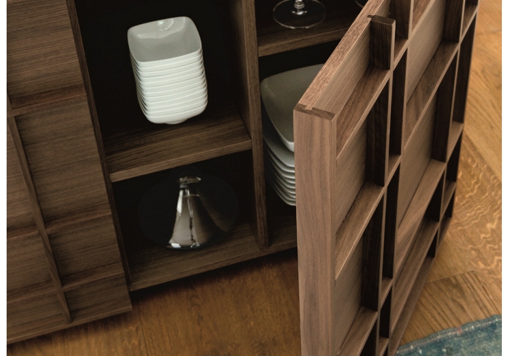 Kilt diseñado por Marconato & Zappa para Porada es un aparador con decoración en nogal canaletta macizo y base en metal negro mate. Las manijas de las puertas laterales, del cajón superior y del cajón hondo inferior centrale se encuentran en la decoración misma.