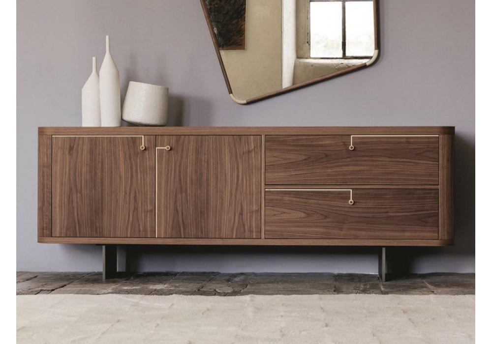 Rondo' diseñado por Umberto Asnago para Porada es un aparador en nogal canaletta con decoración en arce natural y base en latón bronceado cepillado, con dos puertas y dos cajones. También disponible en la versión con un modulo bar adicional a la derechacon puerta en cristal ahumado curvado dotado de elemento botellero giratorio con luz LED. En el interior de un cajón hay un hueco portavasos y una bandeja para cubertería. Bandeja Rondo incluida.