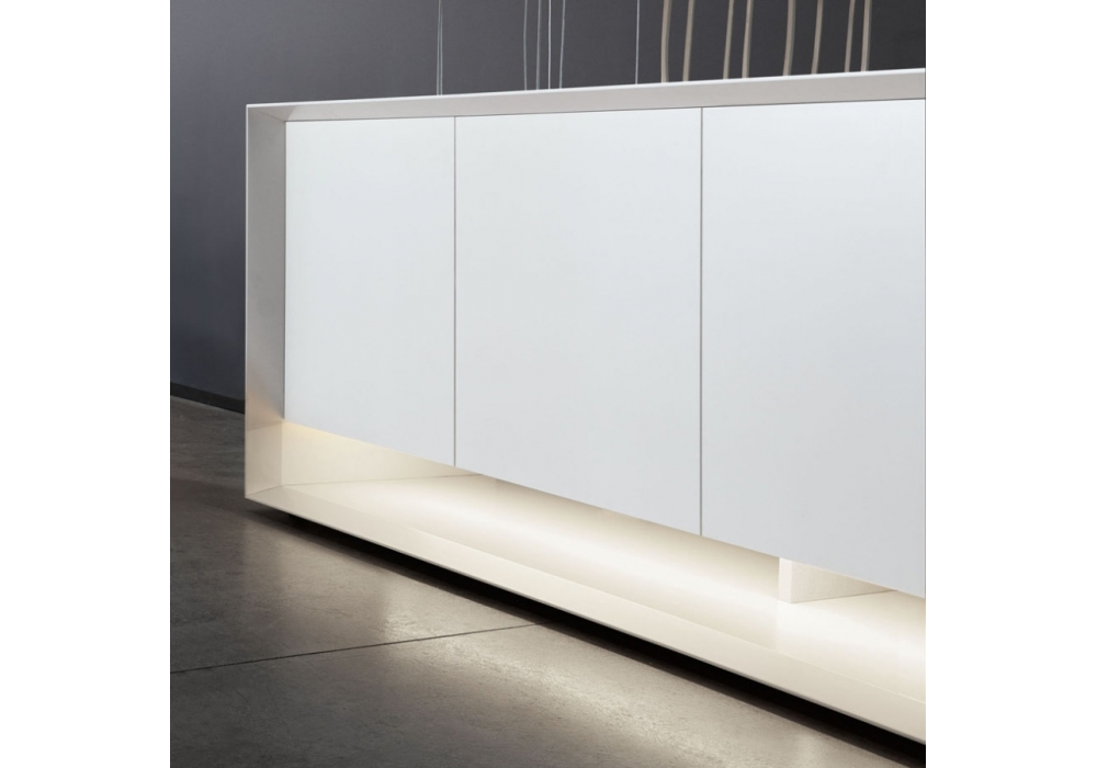 Sunrise diseñado por Gino Carollo para Bonaldo es un aparador con estructura de madera lacada. También disponible con fuente de luz.