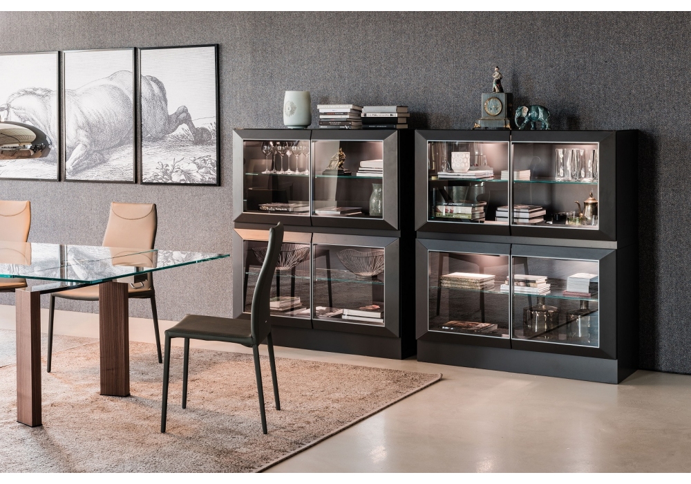 Hilton diseñado por Andrea Lucatello para Cattelan Italia es un aparador con estructura barnizada blanco mate o graphite mate. Perfiles de puerta barnizados en el mismo acabado de la estructura o en nogal Canaletto. Puertas y estantes internos en cristal extraclaro. Aparador h74 y h139 con sobre en cristal extraclaro barnizado en el mismo acabado de la estructura. Opcional: kit iluminación interior led. Disponible en diferentes medidas.