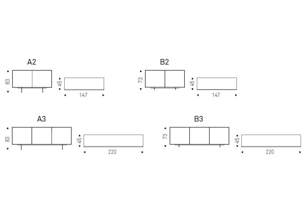 | Dimensiones | • 147 x 45 x H 83 cm; • 147 x 45 x H 73 cm; • 220 x 45 x H 83 cm; • 220 x 45 x H 73 cm |