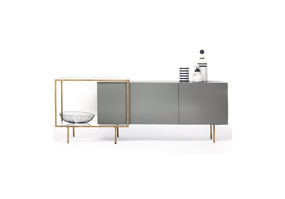 Zoom diseñado por Uto Balmoral para Mogg es un aparador con armazón de metal, completo de estantes de cristal. La estructura realizada en MDF es laqueada gofrada en diferentes colores o en madera de caoba. El armazón de metal es lacado en negro mate o en bronce patinado.