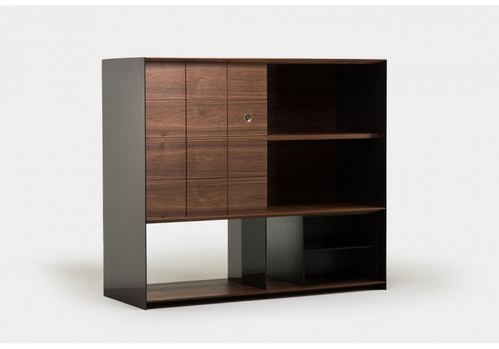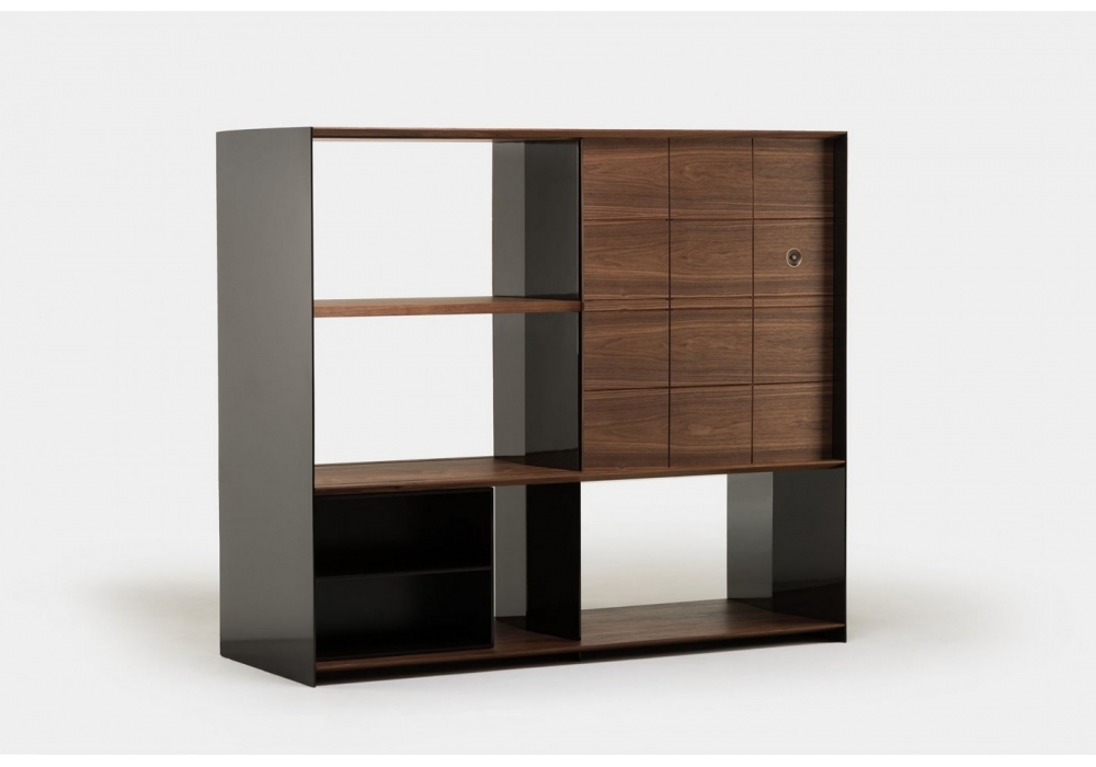 Mitch diseñado por Luca Nichetto u para De La Espada es un mueble contenedor en madera con puertas correderas, paneles verticales realizados en HDF y detalles en latón cepillado.