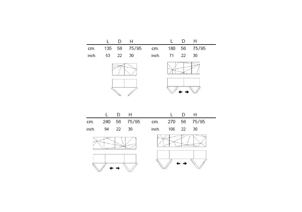 | Dimensiones | L 135 x W 56 x H 75/95 cm; L 180 x W 56 x H 75/95 cm; L 240 x W 56 x H 75/95 cm; L 270 x W 56 x H 75/95 cm |