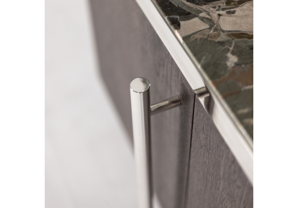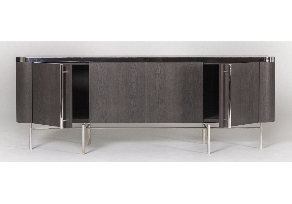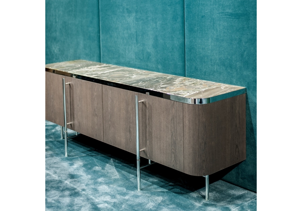 De-mode diseñado por Uto Balmoral para Emmemobili es un aparador disponible en diferentes acabados. La superficier puede ser en el lo mismo acabado que la estructura o en mármol; perfil, base y manijas en latón plateado. También disponible con 4 o 6 puertas.
