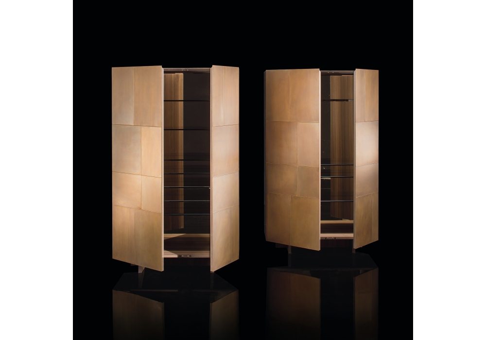 Slim Side Vertical diseñado por Massimo Castagna para Henge es un mueble contenedor con estructura realizada con chapa de madera contrachapada de 2,5 cm de espesor, revestida en el acabado metálico seleccionado. Estantes internos en vidrio bronce. Disponible en dos versiones. Iluminación LED disponible bajo pedido.